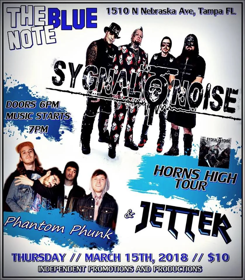 Signal To Noise Thursday, March 15, 2018 7:30 PM 10:30 PM 19:30 22:30 Blue Note 1510 North Nebraska Avenue Tampa, FL, 33602 United States (map) Google Calendar ICS The Blue Note1510 N Nebraska Ave Tampa, Florida 33602Sygnal to Noise // Phantom Phunk // Jetter Doors 6pm // Music kicks off at 7pm